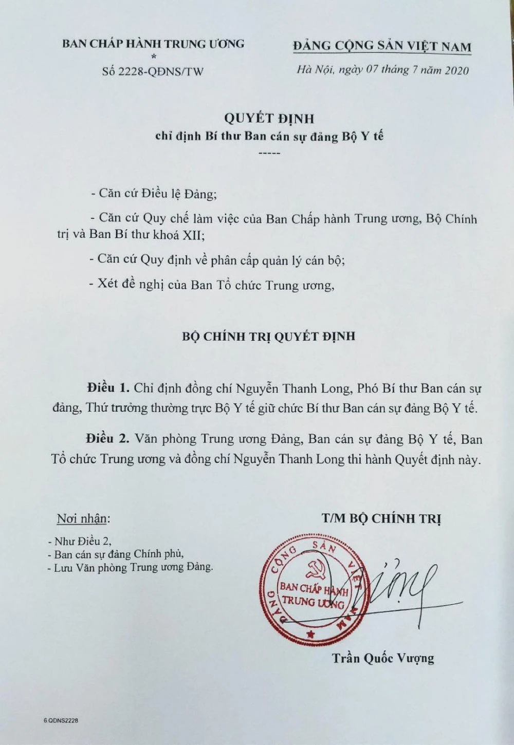 Ngày 7-7, Bộ Chính trị có quyết định số 2228-QĐNS/TW do ông Trần Quốc Vượng - Ủy viên Bộ Chính trị, Thường trực Ban Bí thư - ký, chỉ định ông Nguyễn Thanh Long, Phó Bí thư Ban cán sự đảng, Thứ trưởng Thường trực Bộ Y tế, giữ chức Bí thư Ban cán sự đảng Bộ Y tế.