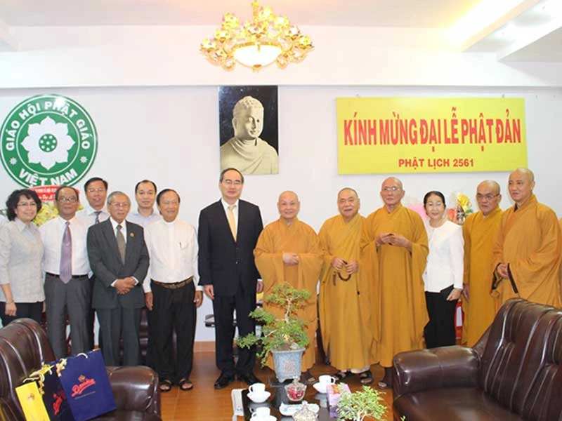 Chủ tịch Ủy ban Trung ương MTTQ Việt Nam Nguyễn Thiện Nhân chúc mừng đại lễ Phật đản 2017 tại Văn phòng II Trung ương Giáo hội Phật giáo Việt Nam. Ảnh: plo.vn