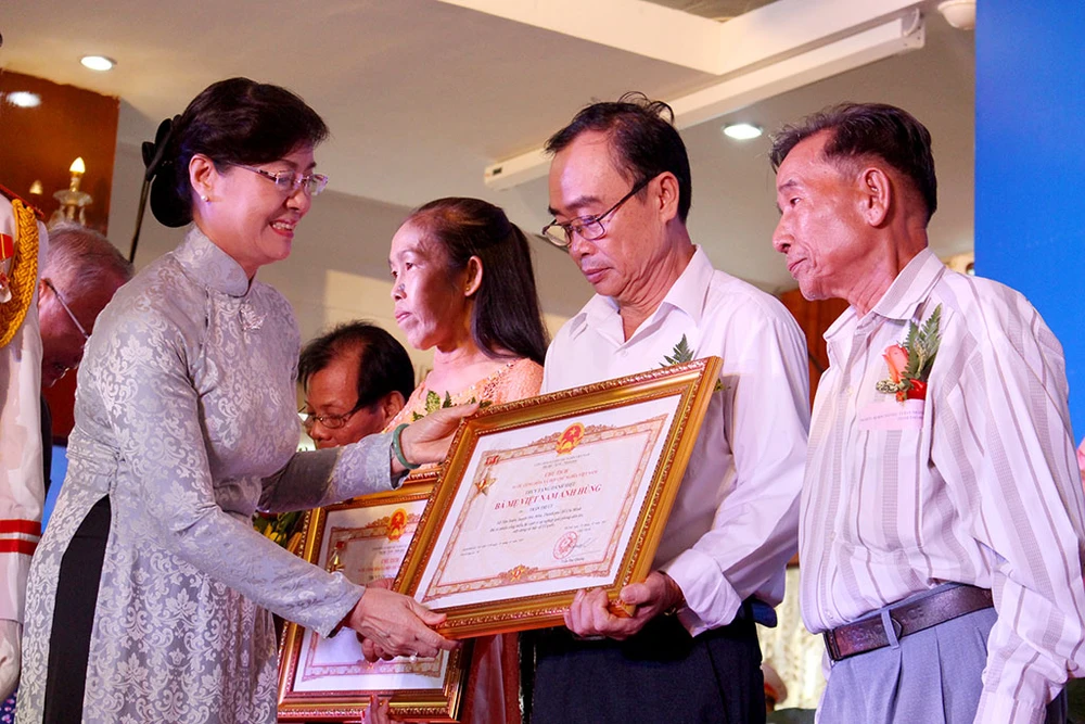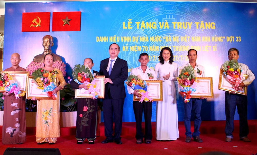 Bí thư Thành ủy TP.HCM Nguyễn Thiện Nhân và Phó Chủ tịch UBND TP Nguyễn Thị Thu truy tặng danh hiệu Bà mẹ VNAH cho gia đình các mẹ. Ảnh: L. THOA