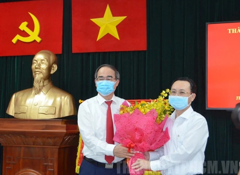 Bí thư Thành ủy TP.HCM Nguyễn Thiện Nhân trao quyết định, tặng hoa cho ông Nguyễn Văn Hiếu. Ảnh: Web Thành ủy TP.HCM