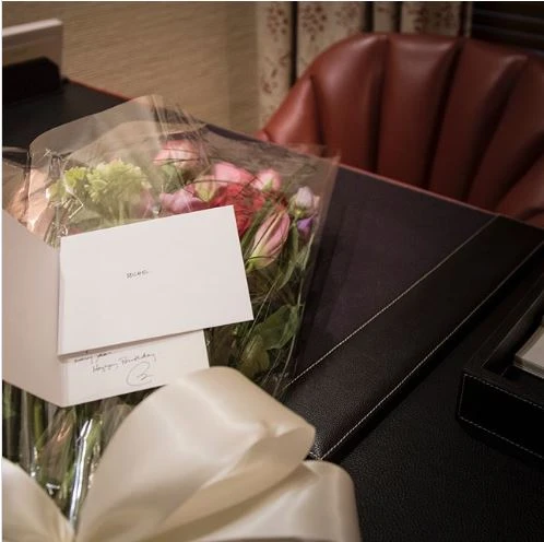 "Cám ơn anh vì những bông hoa tuyệt đẹp đã chờ sẵn trên bàn làm việc của em sáng nay. Anh là tri kỷ của em, cũng là fan hâm mộ trung thành nhất. Việc nhận hoa và thiệp từ anh chưa bao giờ là điều nhàm chán đối với em".