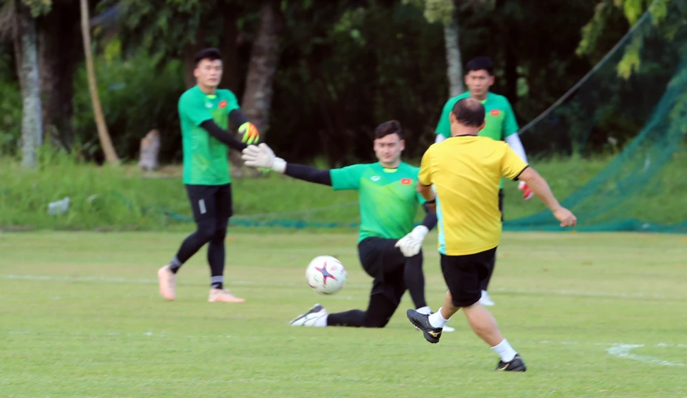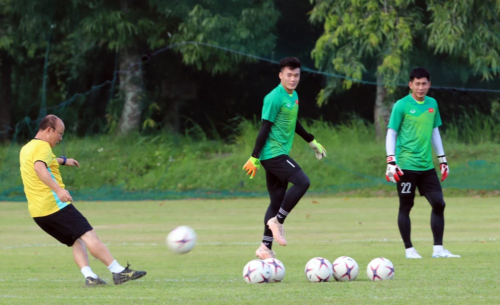 Chiều 30-11, ông Park Hang-seo dành nhiều thời gian huấn luyện cho các tiền đạo và thủ môn với bài chống bóng bổng:
