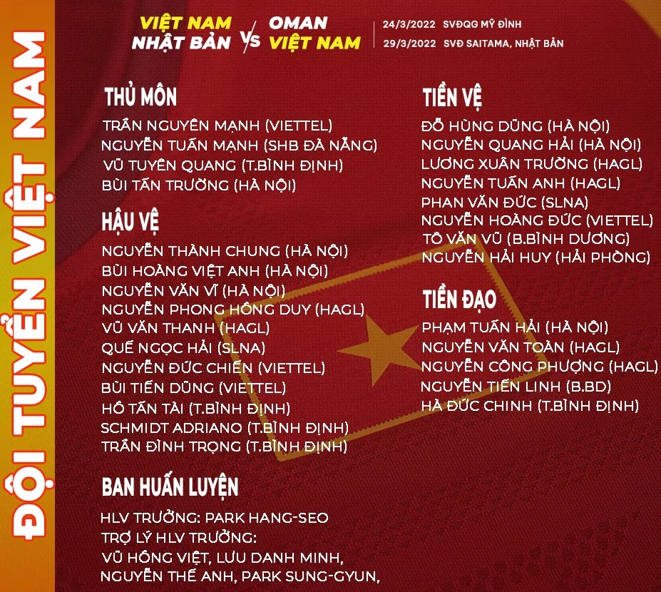 Danh sách đội tuyển Việt Nam. Ảnh: VFF.
