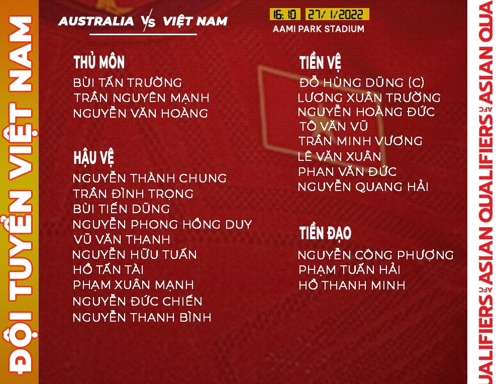 Trong số 8 cầu thủ nói trên, Quế Ngọc Hải đã nhận hai thẻ vàng nên không có tên trong danh sách đăng ký thi đấu trận làm khách Úc ngày 27-1. Tiến Linh, Văn Toàn vẫn đang trong thời gian theo dõi sức khỏe tại nhà dù đã có kết quả âm tính với COVID-19 và sẽ lên tập trung trong ít ngày tới. Theo VFF, hai tân binh gọi lên sau là Ngân Văn Đại và Phi Sơn do được bổ sung muộn nên đã không kịp hoàn tất các thủ tục để xin visa theo quy định của Chính phủ Úc.