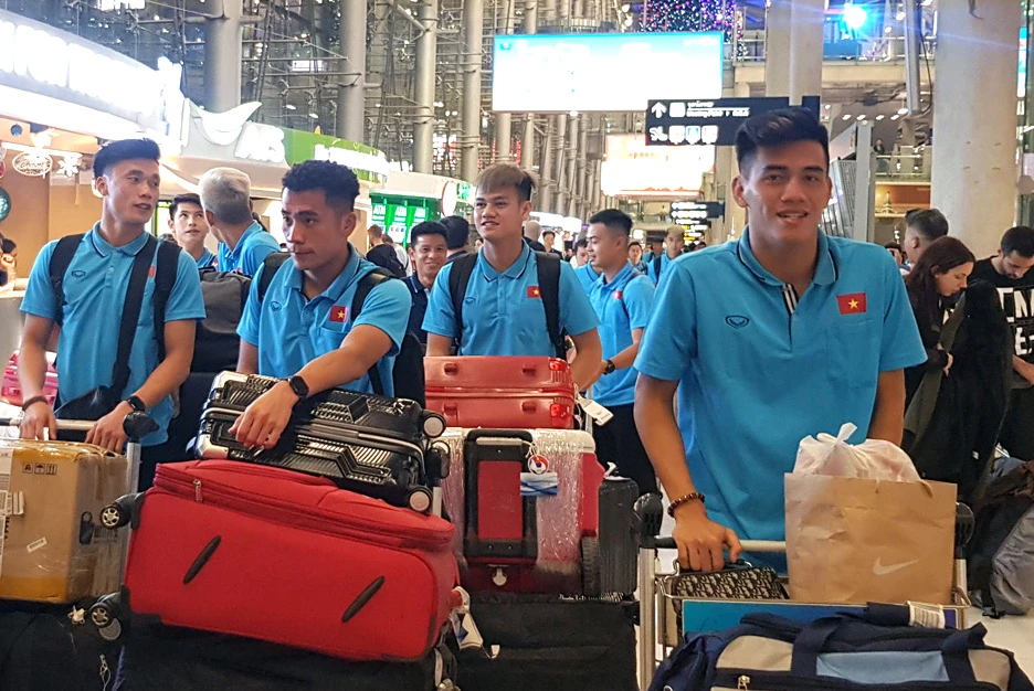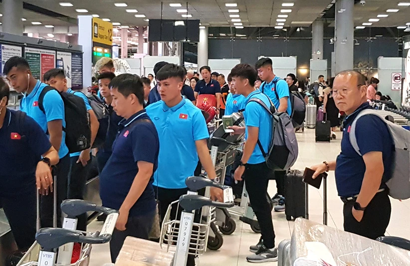 HLV Park Hang-seo và các học trò tại sân bay Thái Lan. ẢNH: VFF