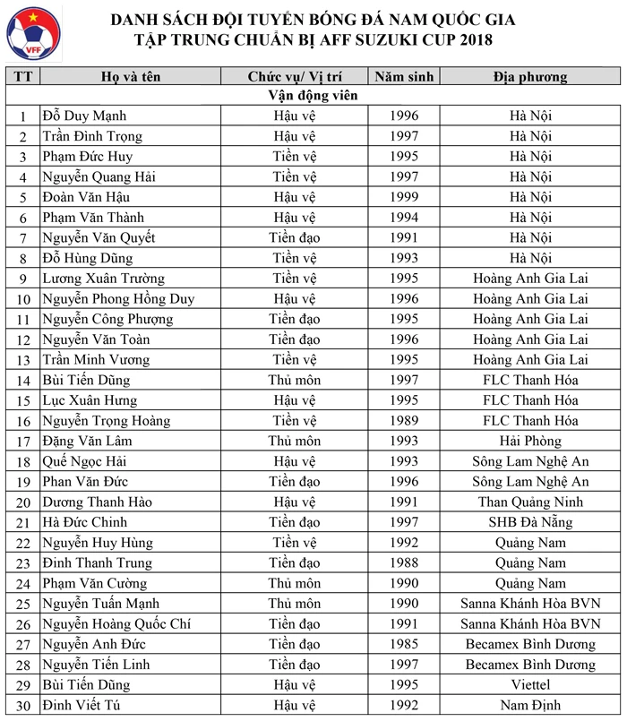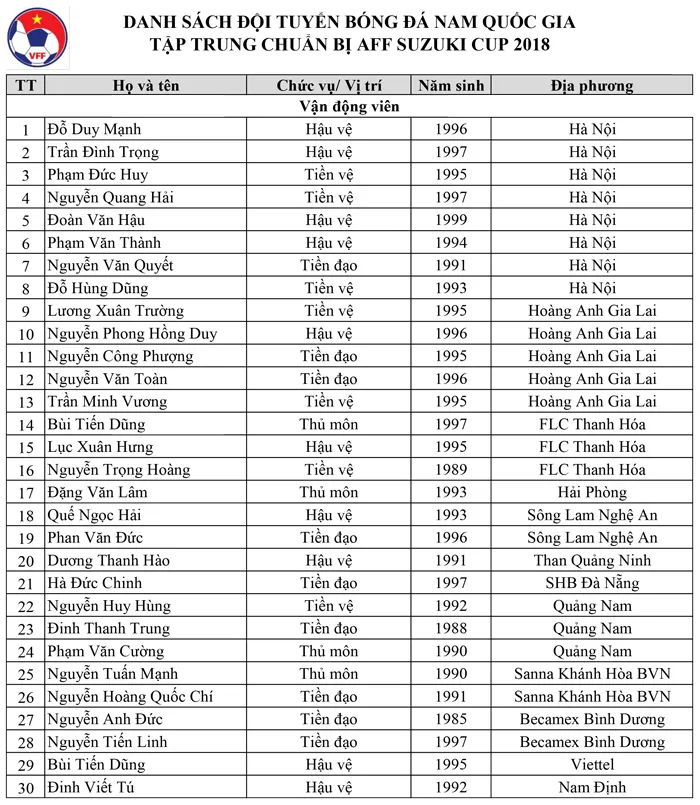 Danh sách 30 cầu thủ dự tuyển Việt Nam chuẩn bị AFF Cup 2018.