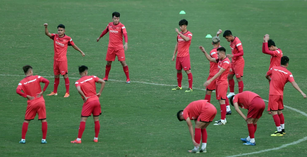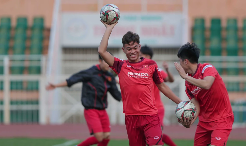 Các tuyển thủ trẻ thích nghi trở lại với mặt sân cỏ tự nhiên, sau một thời gian dài tập luyện và thi đấu trên sân cỏ nhân tạo ở SEA Games 30. Ảnh: ANH PHƯƠNG