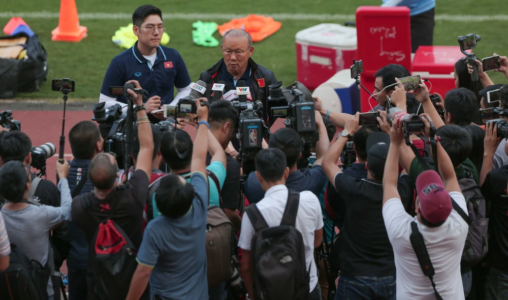 HLV Park Hang-seo chia sẻ tình hình của đội tuyển U-23 Việt Nam với truyền thông trên sân Thống Nhất. Ảnh: ANH PHƯƠNG