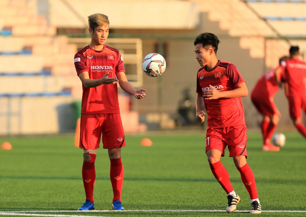 Trọng Đại và Triệu Việt Hưng tại buổi tập của đội tuyển U-22 Việt Nam. Ảnh: NGỌC DUNG