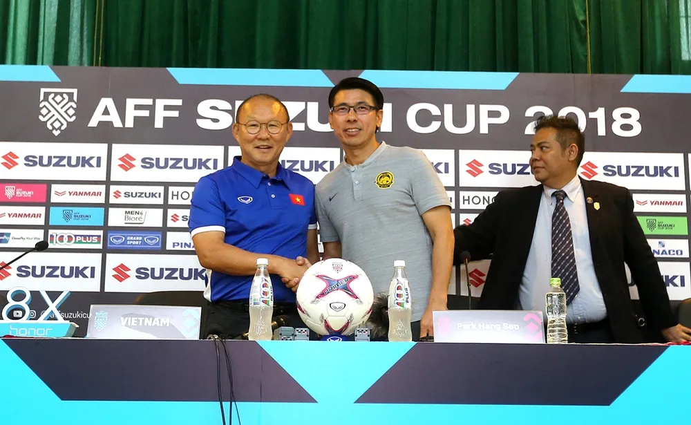 HLV Park Hang-seo có thành tích vượt trội đồng nghiệp Tan Cheng Hoe của tuyển Malaysia và giải thưởng lớn chắc chắn về tay ông thầy Hàn. Ảnh: NGỌC DUNG