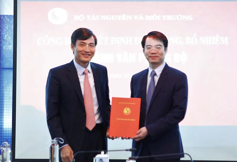 Thứ trưởng Bộ TN&MT Trần Quý Kiên (trái) trao quyết định bổ nhiệm ông Phạm Tân Tuyến làm Chánh Văn phòng Bộ TN&MT