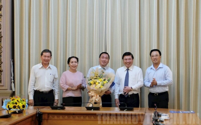 Chủ tịch UBND TP Nguyễn Thành Phong trao quyết định và tặng hoa chúc mừng ông Phạm Thành Kiên. Ảnh: Web Thành ủy TP.HCM.