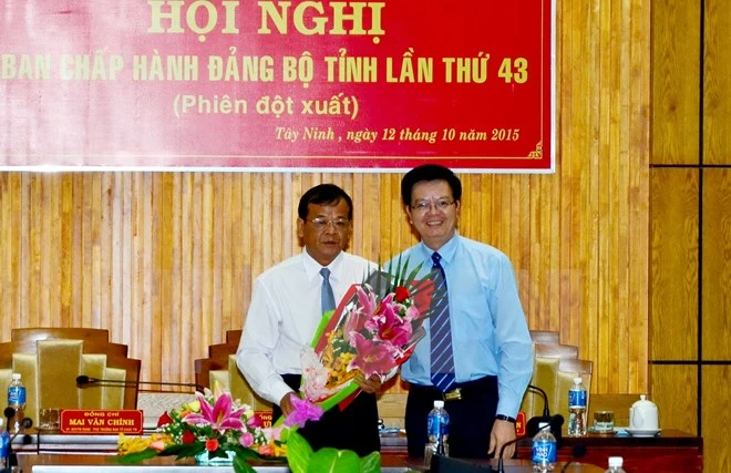 Ông Mai Văn Chính, Ủy viên Trung ương Đảng, Phó trưởng Ban Tổ chức Trung ương (phải) tặng hoa chúc mừng ông Phạm Văn Tân. (Ảnh: Thanh Tân/TTXVN)