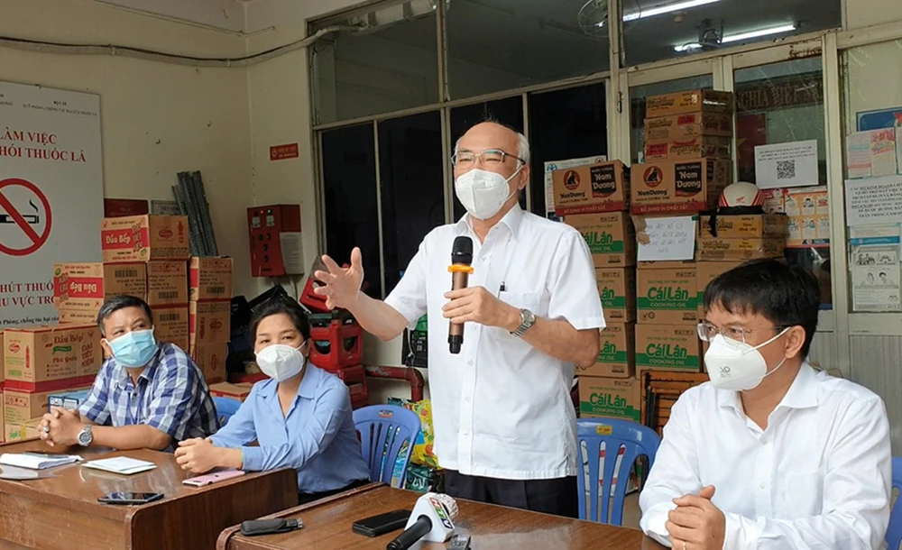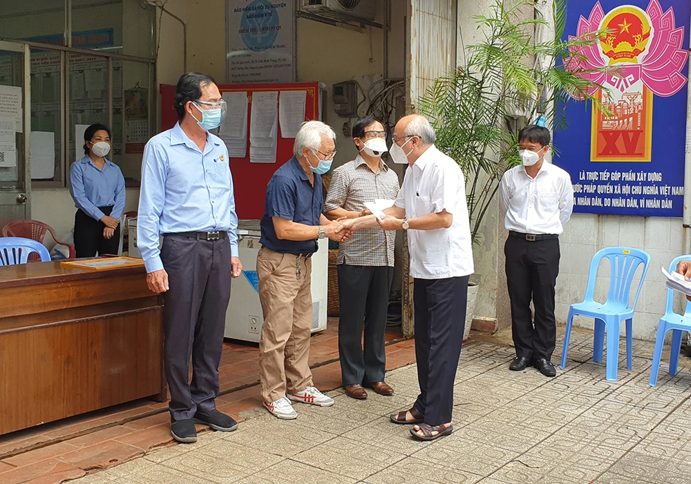 Sáng 2-9, ông Khuê cùng đoàn công tác đã đến UBND các phường ở quận 5 thăm hỏi, động viên và trao quà cho lực lượng tuyến đầu chống dịch. Ảnh: NT