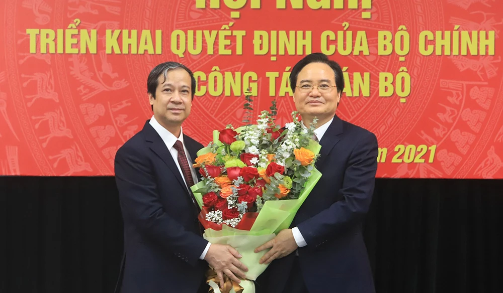 Bộ trưởng Bộ GD&ĐT Nguyễn Kim Sơn tặng hoa chúc mừng tân Phó Ban Tuyên giáo Trung ương Phùng Xuân Nhạ. Ảnh: T.HẰNG