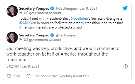 Trong một tuyên bố trên trang Twitter cá nhân, ông Pompeo xác nhận đã có cuộc gặp với ông Blinken nhằm “tạo điều kiện thuận lợi cho quá trình chuyển đổi quyền lực diễn ra một cách trật tự, đảm bảo các lợi ích của nước Mỹ được bảo vệ”.