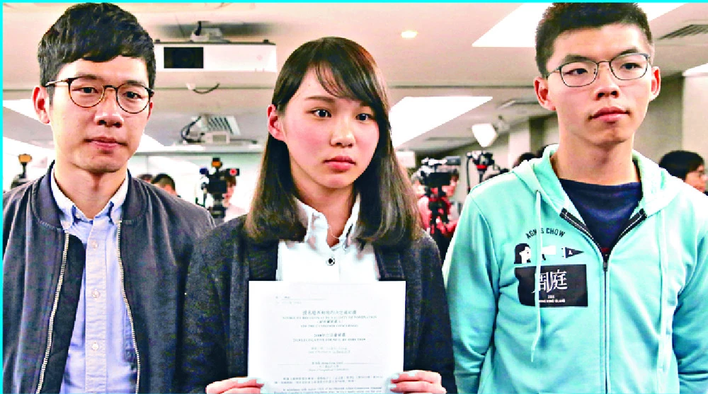 La Quán Thông (trái), Châu Đình (giữa), Hoàng Chi Phong (phải) – ba nhân vật thành lập đảng Demosisto ở Hong Kong. Ảnh: THE STANDARD.
