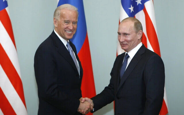 Ông Joe Biden khi đó là Phó Tổng thống Mỹ (trái) bắt tay ông Vladimir Putin khi đó là Thủ tướng Nga tại Moscow (Nga) ngày 10-3-2011. Ảnh: Alexander Zemlianichenko/AP