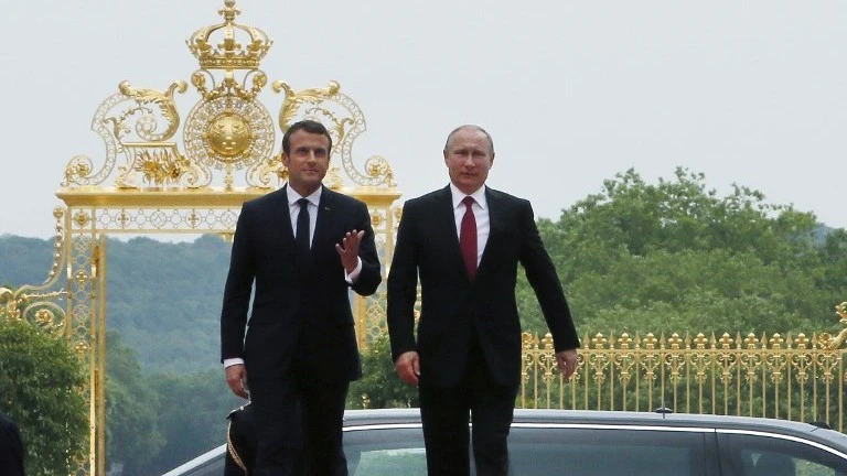 Tổng thống Pháp Macron (trái) và Tổng thống Nga Putin. Ảnh: AFP