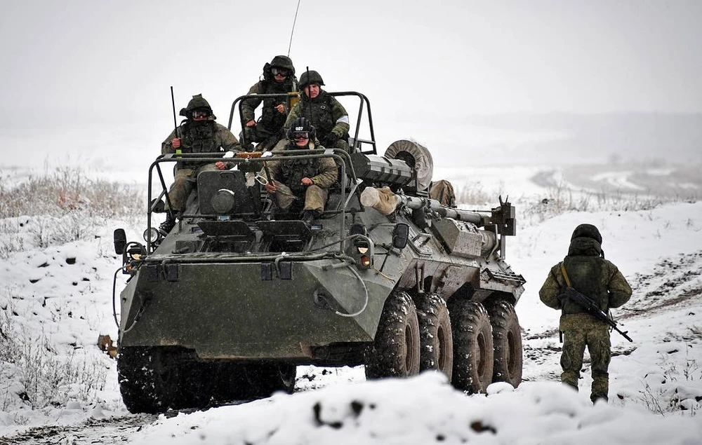 Một cuộc tập trận bắn đạn thật của một tiểu đoàn thuộc Hạm đội Thái Bình Dương của hải quân Nga tại bãi tập Klerk. Ảnh: Yuri Smityuk/TASS