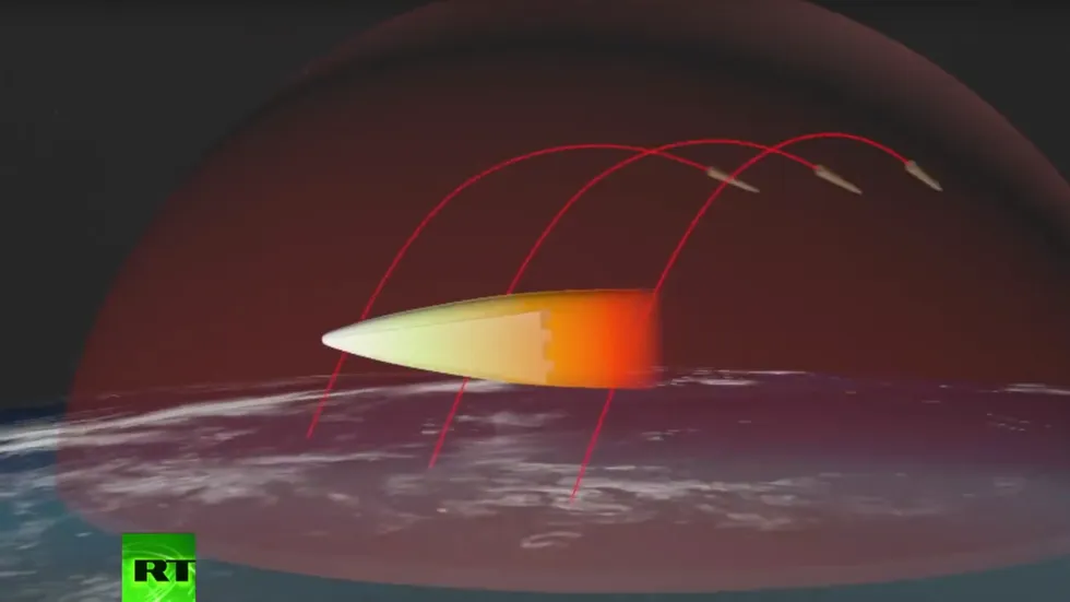 Hình ảnh mô phỏng tên lửa siêu thanh Avangard xuyên qua hệ thống phòng thủ tên lửa. Ảnh: RT