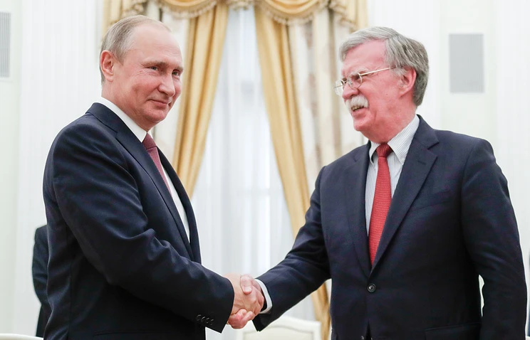 Tổng thống Nga Vladimir Putin và Cố vấn An ninh quốc gia Mỹ John Bolton. Ảnh: TASS