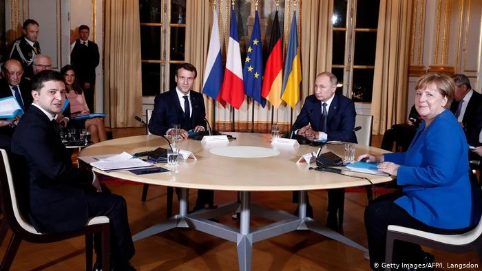 Cuộc họp ở Paris nhằm đưa thỏa thuận hòa bình năm 2015 được ký bởi Ukraine và Nga ở Minsk trở lại quỹ đạo. Với Pháp và Đức giữ vai trò trung gian, thỏa thuận Minsk 2015 yêu cầu rút tất cả vũ khí hạng nặng, khôi phục quyền kiểm soát của chính phủ Kiev đối với các biên giới của nước này, tự trị rộng hơn và bầu cử địa phương ở các khu vực ly khai.