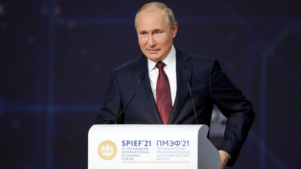 Tổng thống Nga Vladimir Putin phát biểu tại Diễn đàn Kinh tế quốc tế St. Petersburg. Ảnh: CGTN