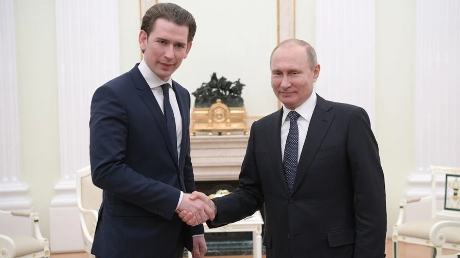 Tổng thống Nga Vladimir Putin (phải) và Thủ tướng Áo Sebastian Kurz trong cuộc gặp hôm 28-2 ở Moscow. Ảnh: RT