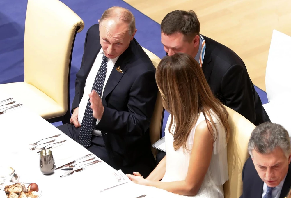 Tổng thống Nga Vladimir Putin và Đệ nhất phu nhân Mỹ Melania Trump trò chuyện tại bữa tiệc ở Hội nghị thượng đỉnh G20 diễn ra ở Đức tháng 7-2017. Ảnh: GETTY
