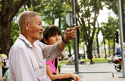 Ông Sáu trò chuyện với cô sinh viên về những đổi thay của Sài Gòn. Ảnh: HG