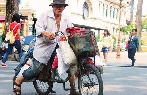 1. Như thường lệ, cứ 3 giờ sáng mỗi ngày, ông Nguyễn Văn Ngọc (80 tuổi) lom khom dậy nhóm lửa nấu cơm đùm mang theo ăn cả ngày khi đi nhặt ve chai. Ông treo trên chiếc xe đạp cũ kỹ rồi dắt nó rời căn nhà trọ ở đường Tôn Đản, quận 4 vào lúc 5 giờ sáng. Qua nhiều chặng đường, điểm dừng chân của ông là Công viên 30-4. Những người dân quanh công viên hay gọi ông với cái tên thân thiết là “ông Sáu ve chai”.