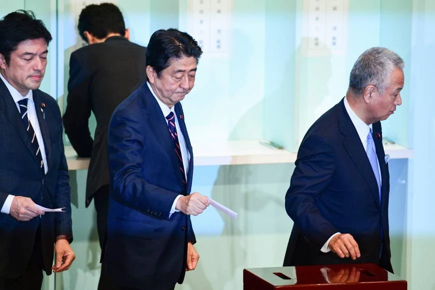 Thủ tướng Nhật Bản Shinzo Abe bỏ phiếu trong cuộc bầu chủ tịch đảng LDP ngày 20-9. Ảnh: AFP