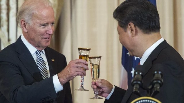 Ông Joe Biden, khi còn là Phó Tổng thống Mỹ, và lãnh đạo Trung Quốc Tập Cận Bình nâng ly chúc mừng ở Washington vào năm 2015. Ảnh: AFP