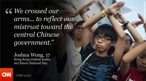 Lãnh đạo học sinh tuổi Teen Joshua Wong quay lưng với quốc kỳ và bắt chéo tay thể hiện sự mất lòng tin với chính phủ Trung Quốc (Ảnh: CNN)