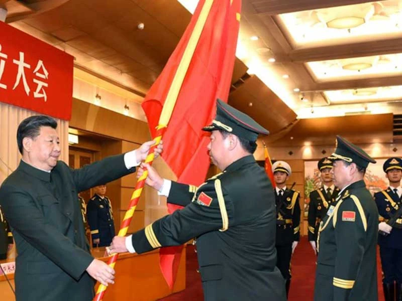 Chủ tịch Trung Quốc Tập Cận Bình trao cờ cho Tư lệnh Lục quân Lý Tác Thành năm 2016. Ảnh: THX
