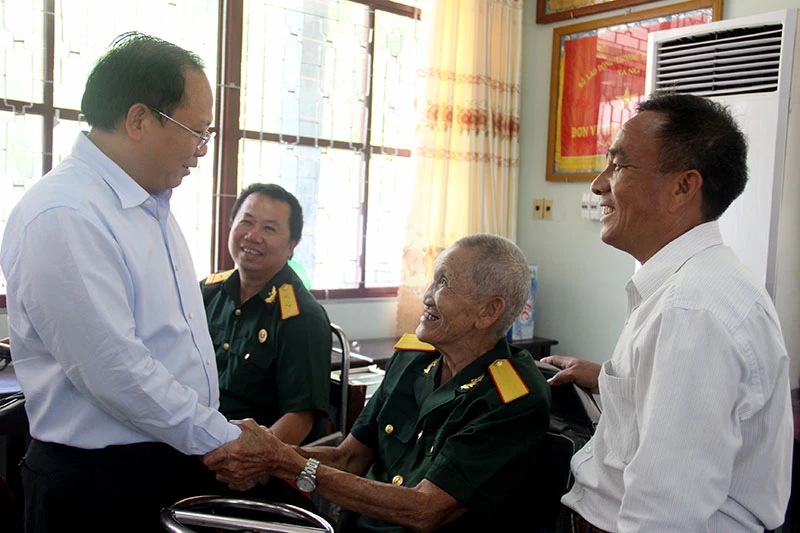 Phó Bí thư Thường trực Thành ủy TP.HCM Tất Thành Cang hỏi thăm các thương bệnh binh. Ảnh: LÊ THOA