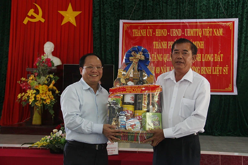 Phó Bí thư Thường trực Thành ủy TP.HCM tặng quà cho Trung tâm Điều dưỡng thương binh và người có công Long Đất. Ảnh: LÊ THOA