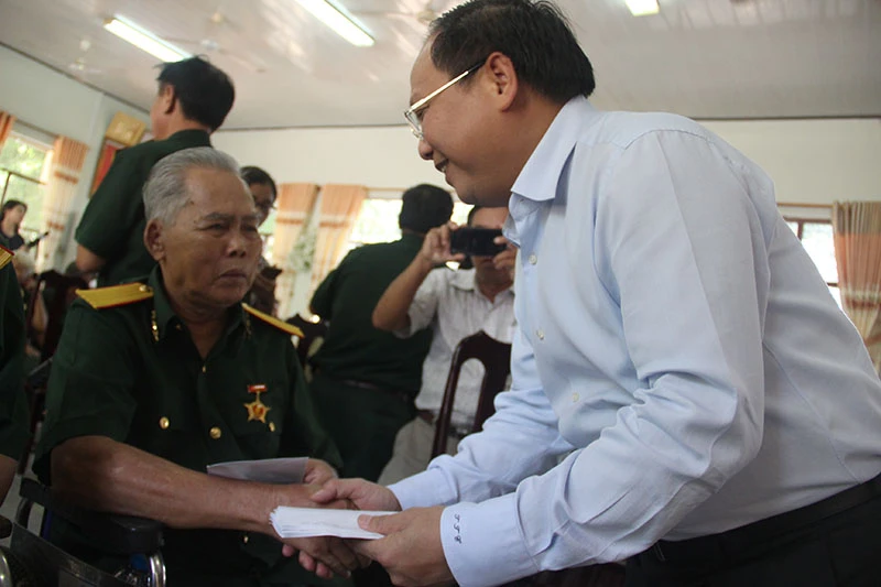 Phó Bí thư Thường trực Thành ủy TP.HCM Tất Thành Cang tặng quà cho các thương bệnh binh. Ảnh: LÊ THOA