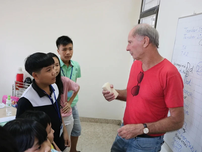 Cách lớp Dolphin không xa, không khí trong lớp học Kiwi rất sôi nổi. Các em đứng thành vòng tròn để giao tiếp tiếng Anh với thầy giáo người New Zealand. “Drive a taxi, dentist, dancer, door...” - cả lớp đọc lớn khi thầy giáo chỉ tay vào từng cụm từ. Với mỗi cụm từ, thầy giáo sẽ giải thích và lấy ví dụ. Khi các em không thể nghe ra được, trợ giảng mới giải thích.
