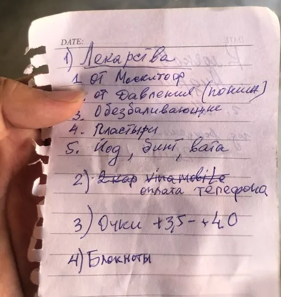 Ông Andrey đã viết chi tiết những vật dụng mà ông cho rằng mình đang rất cần trong lúc này gồm: Thuốc chống muỗi, thuốc cao huyết áp, thuốc giảm đau, bông băng y tế để tự chăm sóc vết thương; thẻ điện thoại; kính lão từ 3,5 đến 4 độ và một cuốn sổ ghi chép.