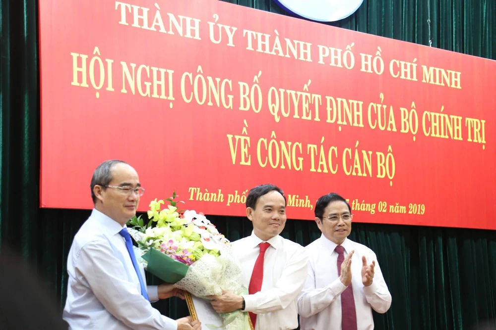 Bí thư Thành ủy TP.HCM Nguyễn Thiện Nhân (bìa trái) cùng Trưởng Ban Tổ chức Trung ương Phạm Minh Chính trao quyết định của Bộ Chính trị và hoa chúc mừng cho ông Trần Lưu Quang.