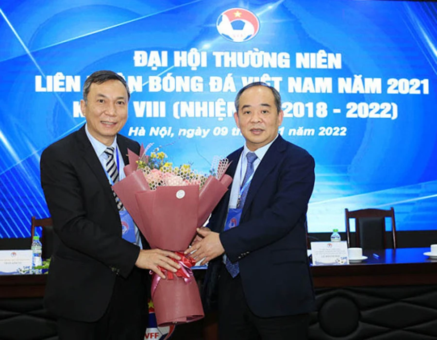 Quyền Chủ tịch VFF Trần Quốc Tuấn và ông Lê Khánh Hải tại Đại hội LĐBĐ Việt Nam chiều 9-1. Ảnh: VFF