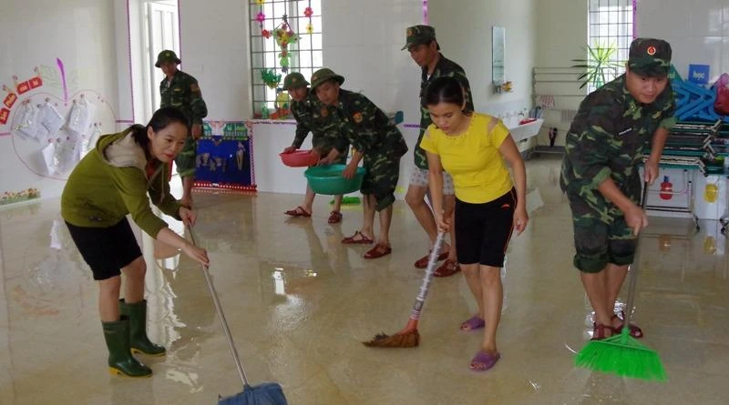 Bộ đội giúp các cô giáo lau dọn bùn ở lớp học khi nước lũ rút đi.