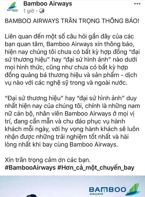 Hãng Bamboo Airways xác nhận, chưa có bất kỳ hợp đồng “đại sứ thương hiệu” hay “đại sứ hình ảnh” nào dưới mọi hình thức, cũng như chưa có bất kỳ hợp đồng quảng bá thương hiệu và sản phẩm - dịch vụ nào với các nghệ sỹ trong và ngoài nước.