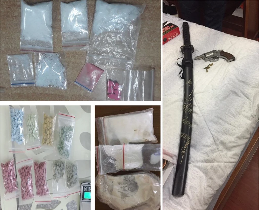 Lượng ma túy lớn cùng súng và kiếm Nhật bị cảnh sát phát hiện. Ảnh: CA