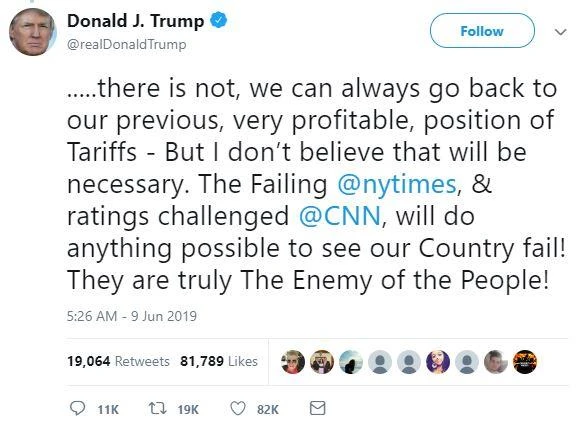 Tổng thống Trump cũng viết trên Twitter: “Bây giờ tôi hoàn toàn tin tưởng, đặc biệt là sau khi nói chuyện với Tổng thống của Mexico hôm 8-6, rằng họ sẽ rất hợp tác và muốn hoàn thành thỏa thuận này đúng cách”.