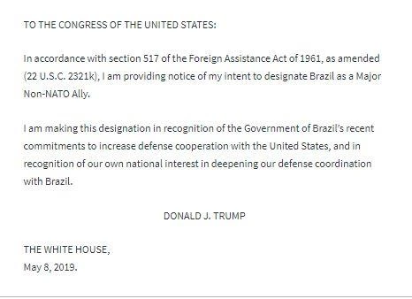 "Tôi đưa ra chỉ định này để ghi nhận các cam kết gần đây của chính phủ Brazil nhằm tăng cường hợp tác quốc phòng với Mỹ và công nhận lợi ích quốc gia của chúng ta trong việc tăng cường hợp tác quốc phòng với Brazil", ông Trump nói trong thông điệp gửi Quốc hội.