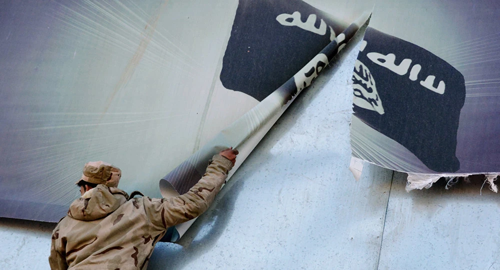 Một thành viên của lực lượng an ninh Iraq xé bỏ một tấm băng-rôn in lá cờ của IS. Ảnh: AFP