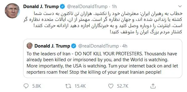 "Gửi những nhà lãnh đạo Iran - Không được giết người biểu tình. Các người đã giết hại hoặc bỏ tù hàng nghìn người, và cả thế giới đang theo dõi" - ông Trump tuyên bố trên Twitter cá nhân bằng tiếng Anh và tiếng Ba Tư.